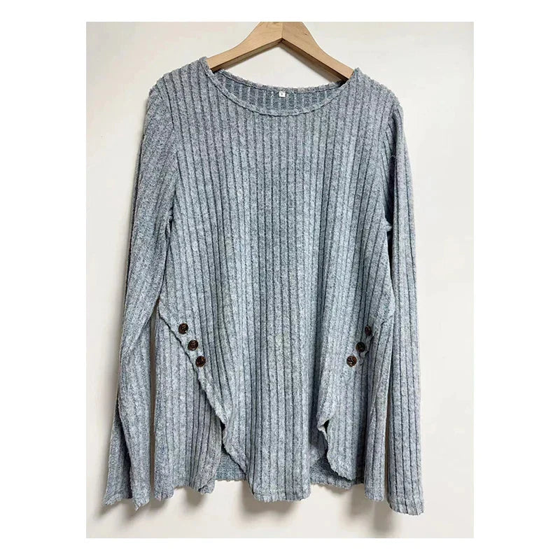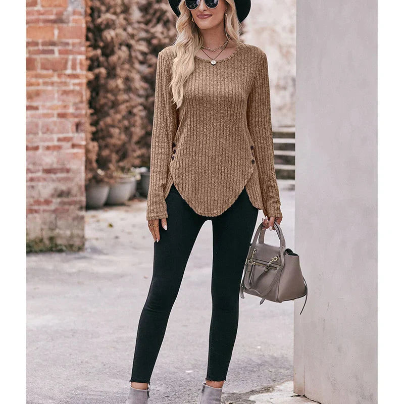 a stylish and comfortable addition to your wardrobe for autumn. This women's long-sleeved blouse features a fashionable round neckline, an irregular split hem, and an oversized fit, giving it a contemporary look. Here's a detailed description of this vintage knit top.