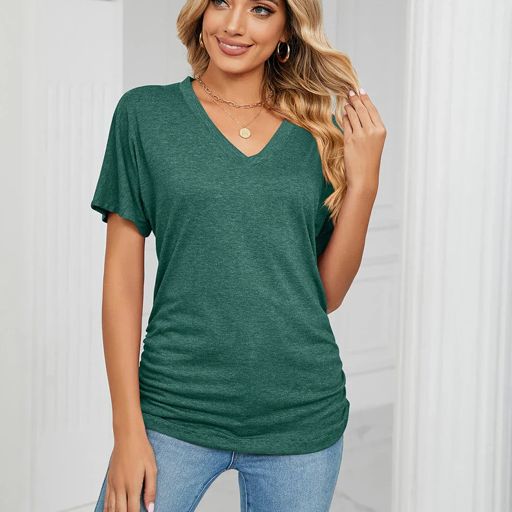 A stylish and comfortable addition to your summer wardrobe. This women's short sleeve blouse has an elegant V-neck, a loose fit and is designed for contemporary feminine style. Here is a detailed description of this summer women's blouse