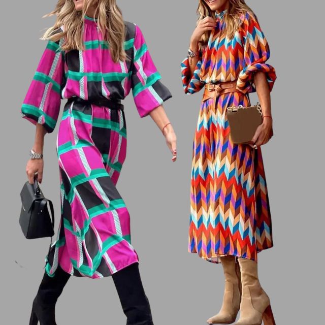 This eye-catching Aleiah - Colourful midi dress with chevron pattern and belt combines vintage charm with contemporary streetwear style. The vibrant geometric print adds a bold, retro touch, perfect for making a statement at any party. With its round neckline and flowing wide hemline, this long dress creates an elegant yet relaxed silhouette. Made from a lightweight fabric, it guarantees comfort and a flattering drape, making it an ideal choice for chic, day-to-night festivities.