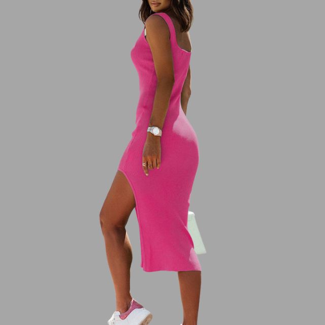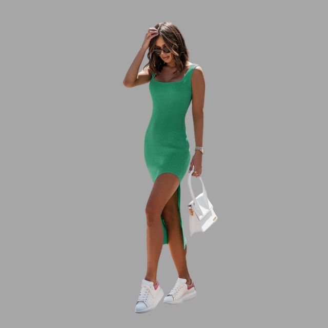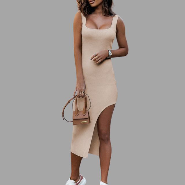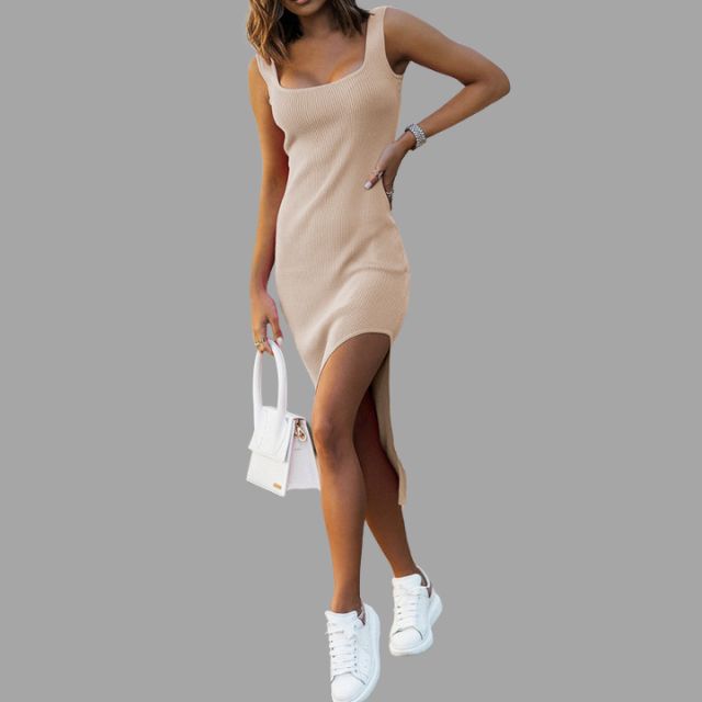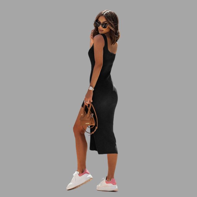 This Alessandra - Sleeveless ribbed knit midi dress with side slit is a mix of comfort and seduction. The scoop neckline and off-the-shoulder design create a subtly sexy vibe, while the side slit adds a touch of daring. Sleeveless and body-hugging, this casual dress is both flattering and versatile, making it a great addition to any plus-size wardrobe for a chic, effortless look.