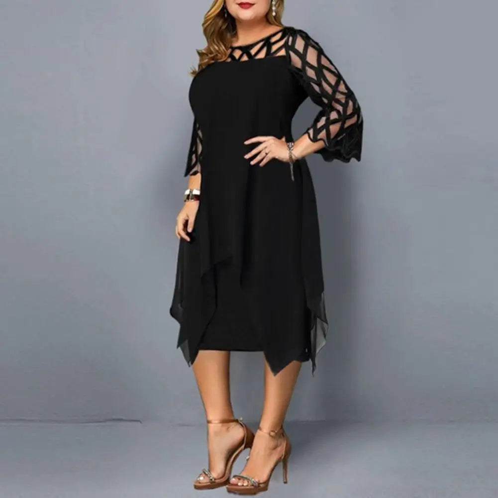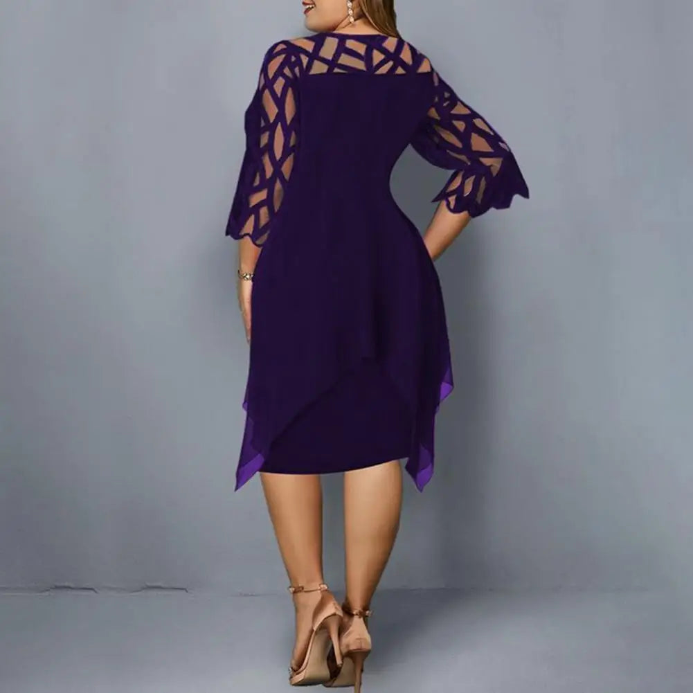 This Aliyah - Asymmetric Evening Dress with Lattice Sleeve Detail is a summer delight, with elegant mesh sleeve detailing that adds a sophisticated touch. The asymmetric hemline gives the dress a modern appeal, making it a perfect choice for casual parties or a night out at the club. It's a comfortable yet stylish ensemble that gives the wearer both confidence and charm.