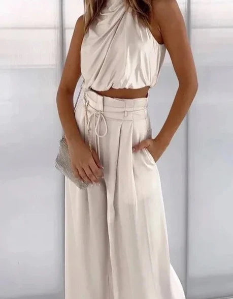 A sophisticated and stylish ensemble, perfect for the office and summer occasions. This set consists of a sleeveless top with a high neckline and matching flared trousers. Here is a detailed description of this elegant women's outfit.De top is voorzien van een stijlvolle hoge nek, wat een elegante en moderne uitstraling geeft .