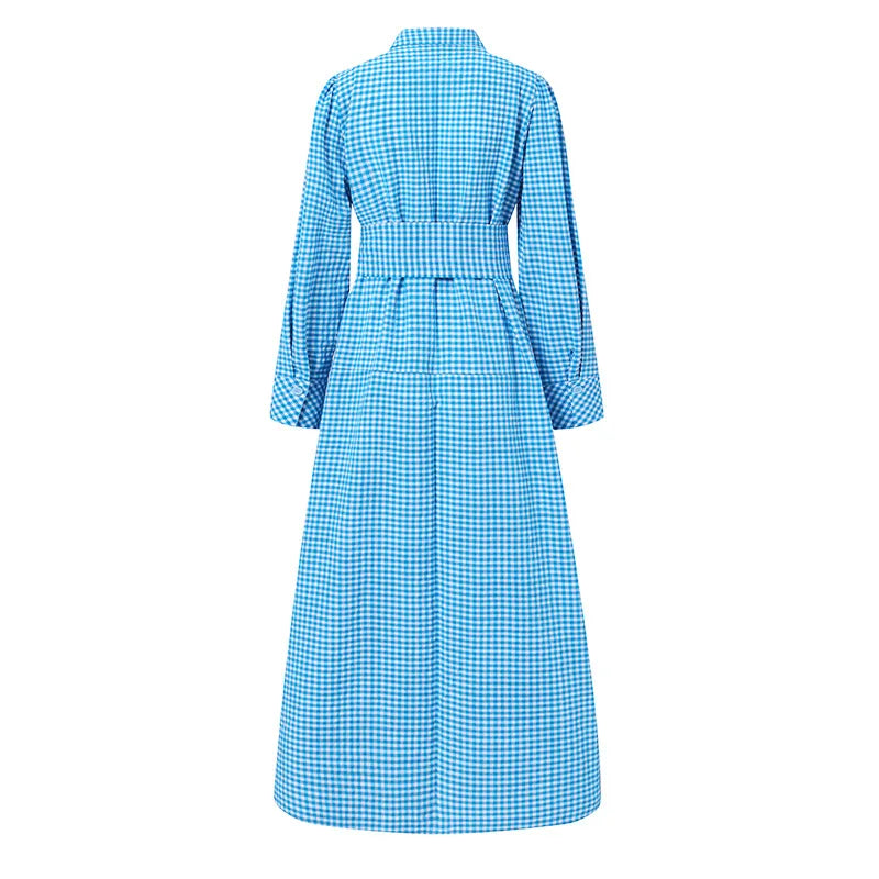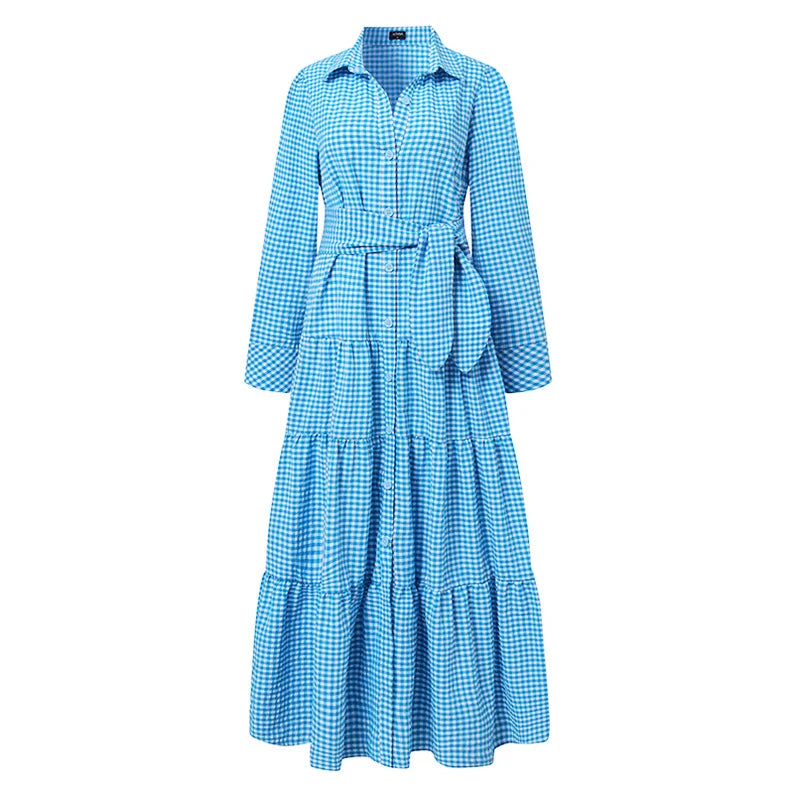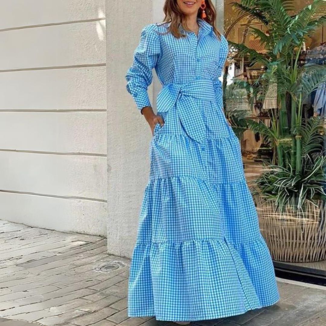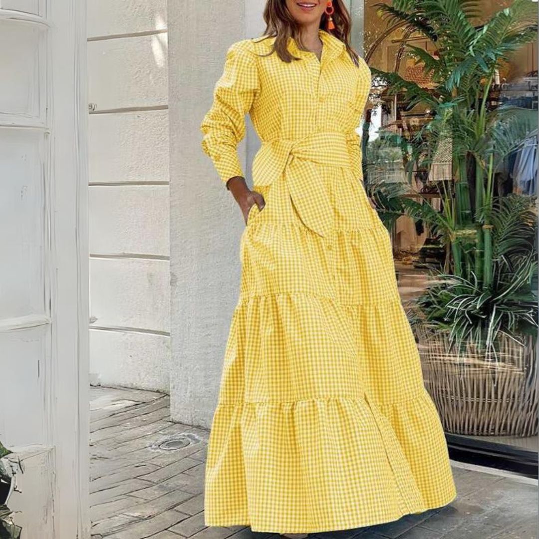 Embrace the sunny side of life with this Amelia - checked shirt dress with tiered skirt and belt. Its classic shirtdress design is enhanced by long sleeves and a tiered maxi skirt that adds a delightful swing to your movements. The tie waist belt creates a flattering shape, making it the ideal choice for picnics, daytime events or just when you fancy a bit of country chic.
