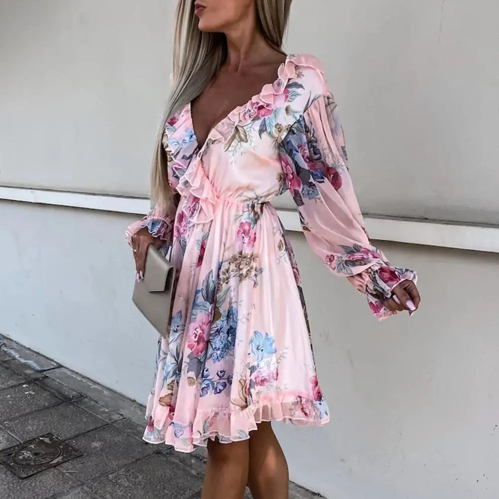 This Amelia - Deep V-neck chiffon dress with floral pattern is a dreamy combination of romance and playfulness, with its lightweight fabric adorned with soft pastel flowers. The ruched V-neckline and soft ruffles at the sleeves and hem give it a playful yet sophisticated appeal, while the fitted waist and flowing skirt celebrate the feminine shape.