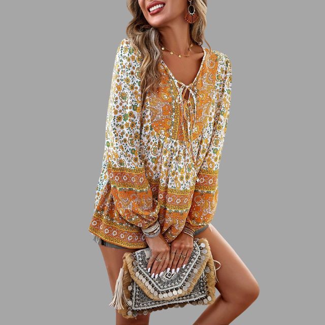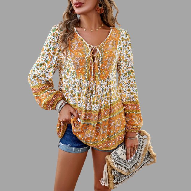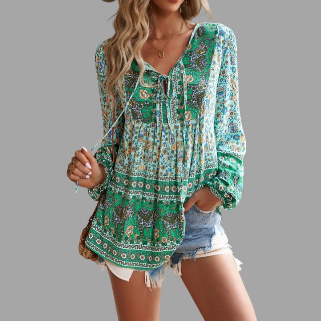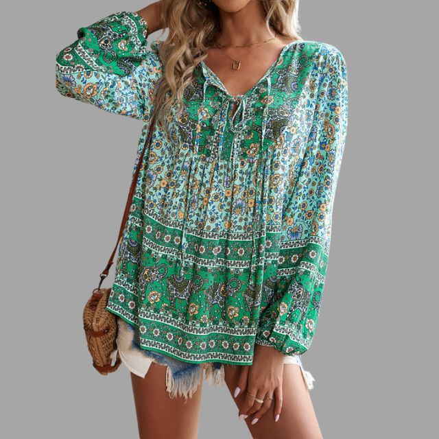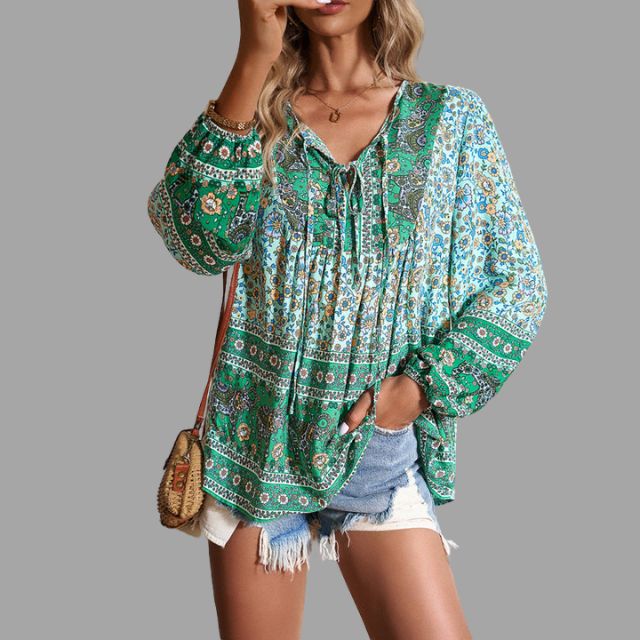Let yourself be tempted by our Antonnia - Bohemian paisley pattern tunic with lace-up neckline and charming floral print. This casual yet fashionable top features long sleeves and a wide, oversized fit that offers both comfort and a casual flair. Ideal for an autumn beach trip or a relaxed day out, it's a versatile piece that will add a touch of laid-back elegance to any outfit.