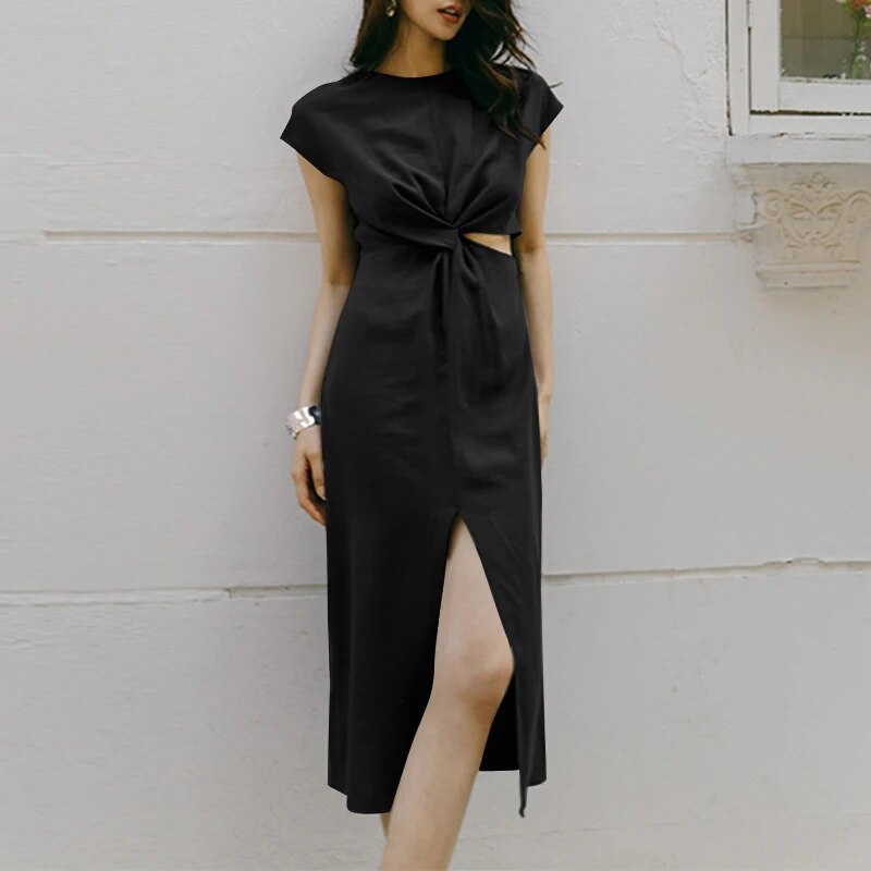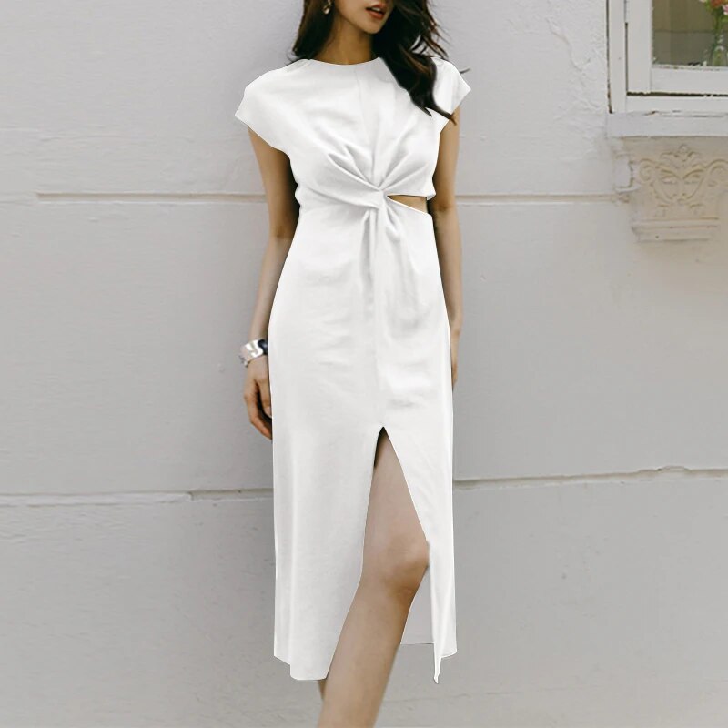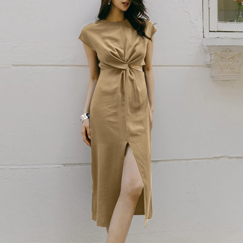 Wilma - Women's Short Sleeve Front Twist Midi Dress with Slit