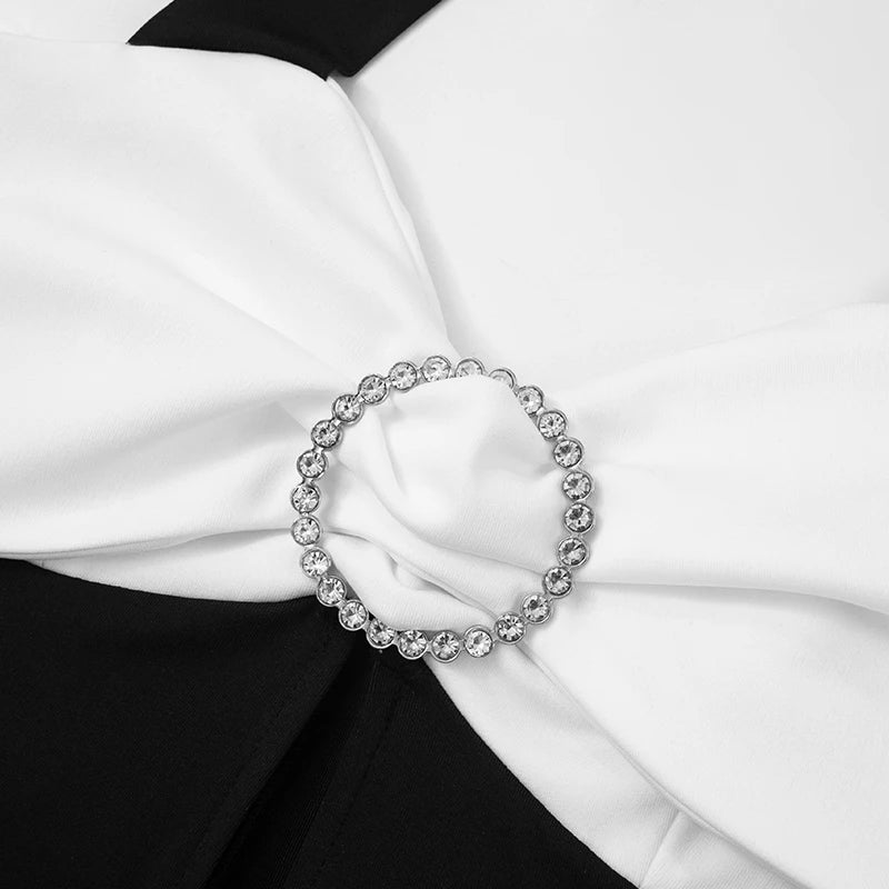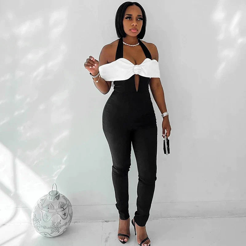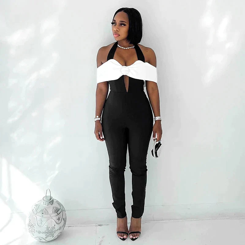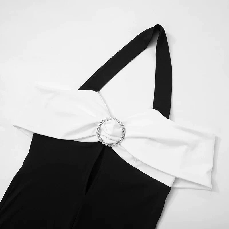 This Zara - Monochrome halterneck jumpsuit with bow accent combines a monochrome colour palette with a bold design. The matching black trousers emphasise the silhouette, while the white bow detail at the top adds an eye-catching contrast and a touch of femininity. This piece is a statement ensemble, perfect for sophisticated evening events where fashionable elegance is required.