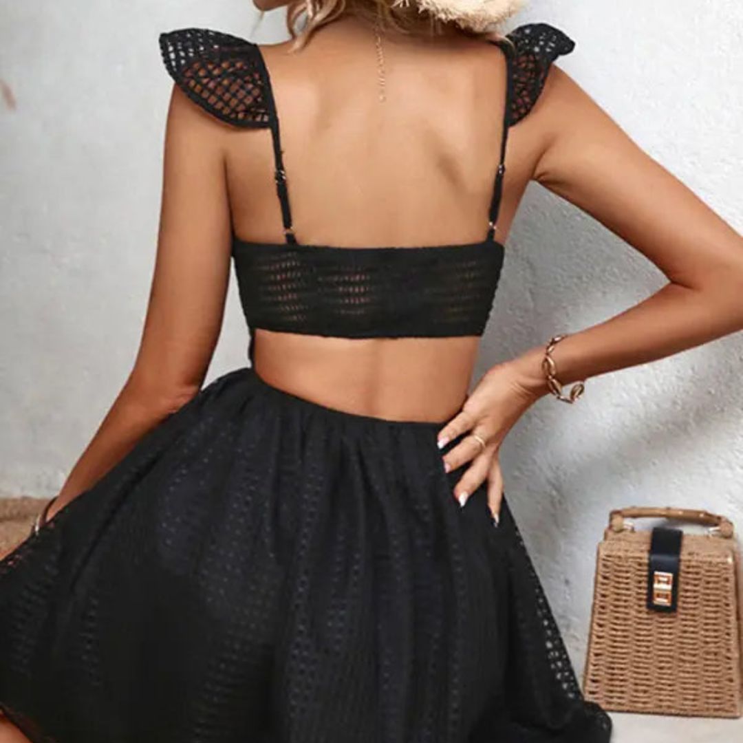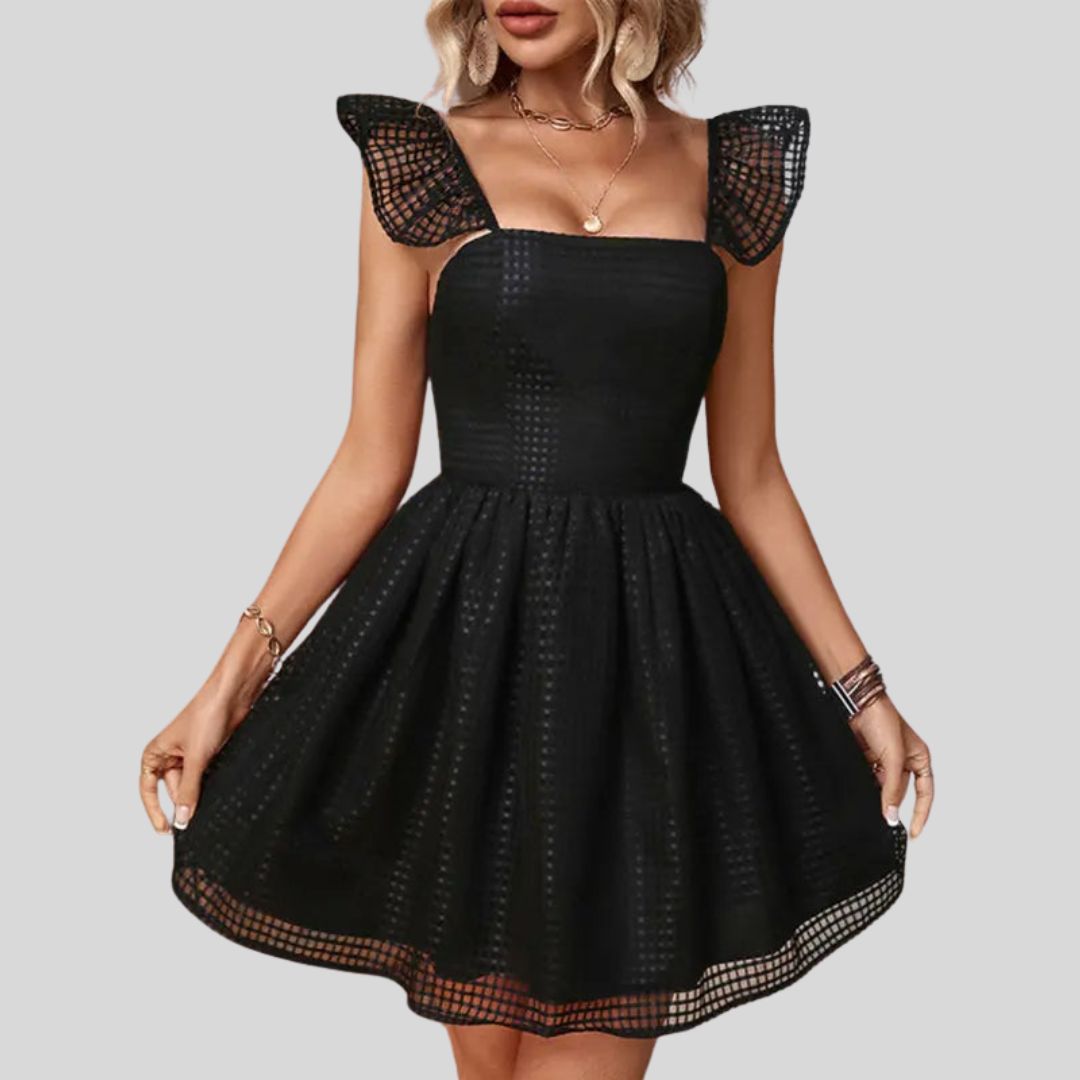 This Zoe - Structured skater dress with mesh puff sleeves offers a modern take on the classic little black dress with its eye-catching dotted mesh shoulders that create a unique cap sleeve effect. The figure-hugging top flares out into a playful skater skirt, finished with a matching dotted mesh hem.